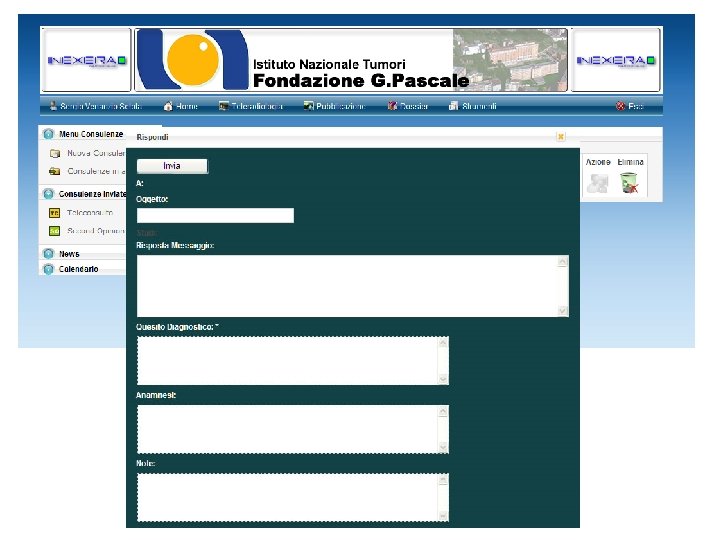 Obiettivi • Ampliamento del Network agli altri IRCCS; • Condivisione con le unità radiologiche periferiche Campane delle competenze specialistiche del Pascale; • Estensione del servizio agli ospedali dei paesi in via di sviluppo dell’area mediterranea; • Approntamento di una formazione continua per i radiologi delle unità periferiche attraverso evolute piattaforme di e-learning.
