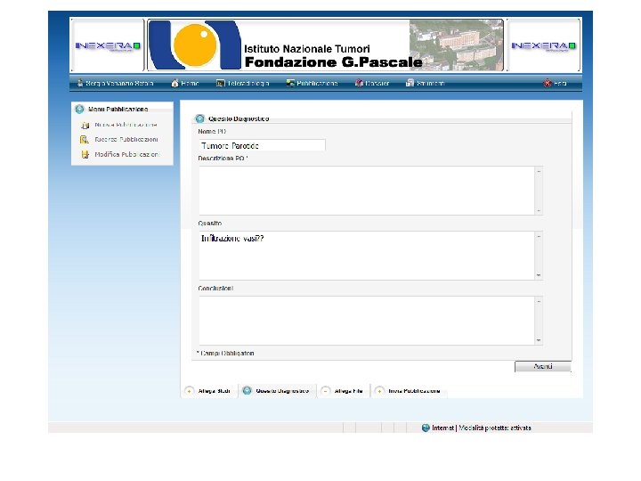 La Fondazione “G. Pascale” • L'Istituto Pascale (formalmente Istituto Nazionale dei Tumori Fondazione G. Pascale) si occupa dello studio e la cura delle neoplasie. • La sua attività è orientata a fornire i servizi più all'avanguardia nella diagnosi e cura delle malattie tumorali, con particolare attenzione non solo alle tecnologie ed alle procedure mediche, ma ai tempi ed alle modalità di erogazione di tali servizi. • L’obiettivo principale della Fondazione è quello di rendere l'Istituto l'arma vincente nelle mani di coloro che si trovano a combattere contro il cosiddetto male del secolo. • Per raggiungere tale obiettivo la Fondazione intende aprirsi sempre più verso l'esterno, sia verso i singoli cittadini che verso le istituzioni sanitarie (le ASL, gli altri istituti di ricovero e cura, gli istituti di ricerca). Gli strumenti per raggiungere questi obiettivi sono le telecomunicazioni e l'informatica.