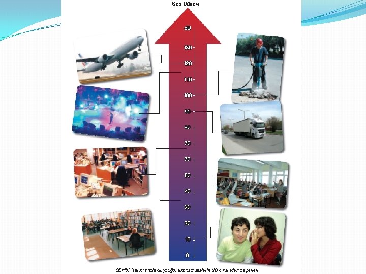 Ses Düzeyi �Bir arının çıkardığı sesin frekansı yaklaşık 1000 Hz iken bir gök gürültüsünün ki yaklaşık 50 Hz'dir fakat gök gürültüsünün sesinden çok daha fazla rahatsız oluruz. �Seslerin işitme sağlığımıza zararlı olup olmadığı, bir sesi duyup duyamamamız, ses düzeyi denilen bir büyüklükle ilgilidir. �Ses düzeyini ölçmek için kullanılan birim desibeldir. Kısaca d. B ile gösterilir. Birçok insanın duyabildiği en düşük ses 0(sıfır) desibeldir.