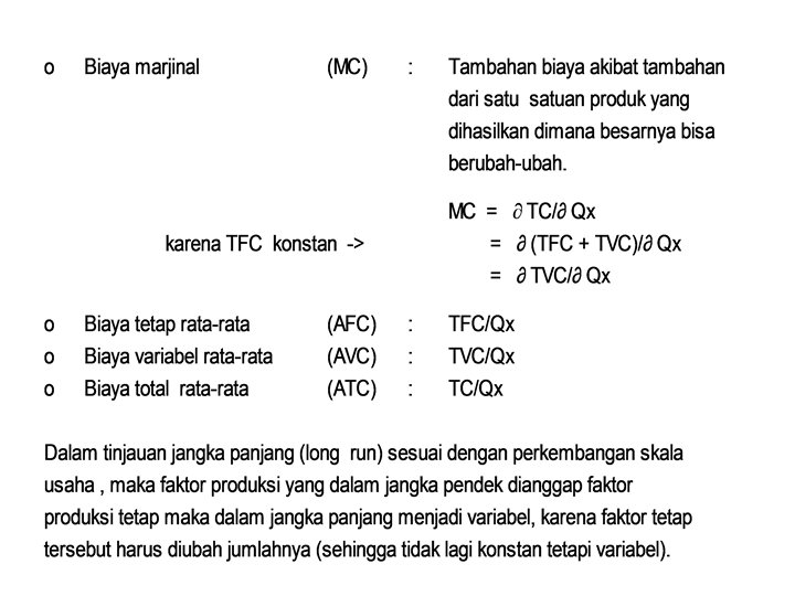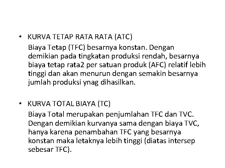 • KURVA TOTAL BIAYA TETAP (TFC) Besarnya konstan pada tingkat produksi berapapun jumlahnya. Dengan demikian TFC linier dengan slope horisontal. • KURVA TOTAL BIAYA VARIABEL (TVC) Besarnya tidak sama pada setiap tingkatan produksi. Dengan demikian kurva TFC tidek linier dengan slope yang berbeda tiap tingkatan produksi, menyesuaikan bentuk fungsi produksinya. • KURVA TOTAL BIAYA (TC) Biaya Total merupakan penjumlahan TFC dan TVC. Dengan demikian kurvanya sama dengan biaya TVC, hanya karena penambahan TFC yang besarnya konstan maka letaknya lebih tinggi (diatas intersep sebesar TFC).