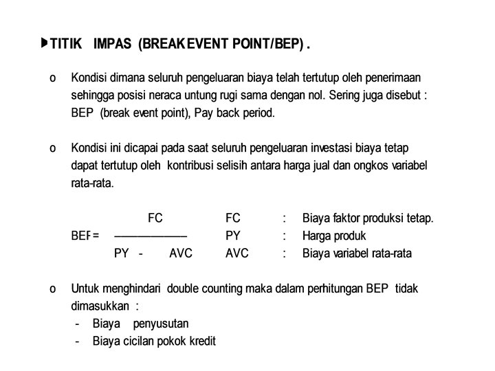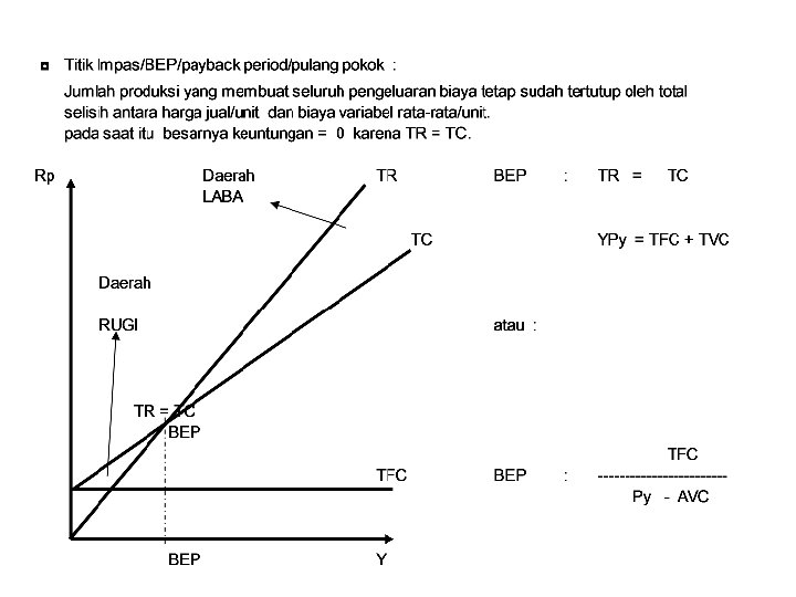 HUBUNGAN TFC, TVC, TC, AVC & MC • Titik terendah AVC pada saat slope TVC paling rendah, karena pada saat itu di kurva produksi posisi APP paling tinggi (Ingat pada saat APP maksimal maka AVC minimal). • Titik terendah Marginal Cost (MC) terjadi pada saat kurva TVC berbalik dari decreasing ke increasing karena pada saat itu dalam kurva produksi MM mencapai maksimum. • MC selalu memotong AVC dan ATC di titik terendah, karena pada saat itu pada kurva produksi MM memotong APP di titik maksimumnya. Dengan demikian AVC kebalikan APP dan MC kebalikan MPP. • Saat MPP mencapai titik maksimal maka MC mencapai titik terendah. • Demikian juga saat APP mencapai titik tertinggi, maka AVP mencapai titik terendah. • Kurva MC akan memotong kurva AVC pada titik terendahnya.