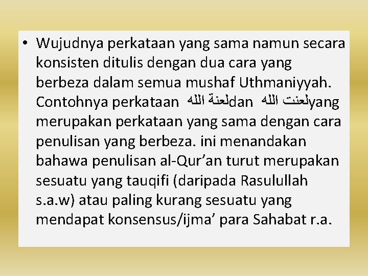 • Wujudnya perkataan yang sama namun secara konsisten ditulis dengan dua cara yang berbeza dalam semua mushaf Uthmaniyyah. Contohnya perkataan ﻟﻌﻨﺔ ﺍﻟﻠﻪ dan ﻟﻌﻨﺖ ﺍﻟﻠﻪ yang merupakan perkataan yang sama dengan cara penulisan yang berbeza. ini menandakan bahawa penulisan al-Qur’an turut merupakan sesuatu yang tauqifi (daripada Rasulullah s. a. w) atau paling kurang sesuatu yang mendapat konsensus/ijma’ para Sahabat r. a.