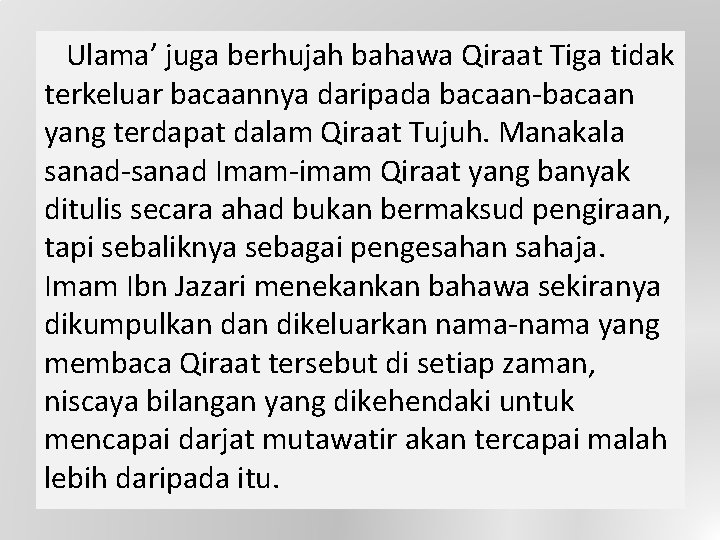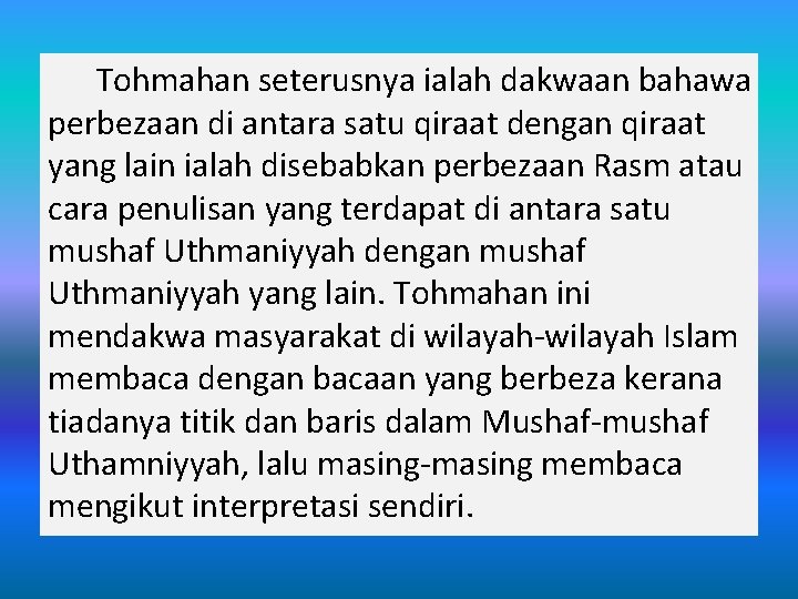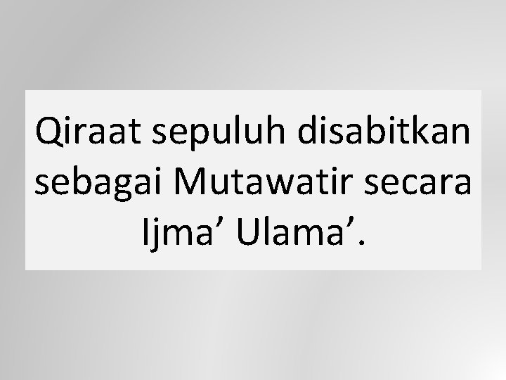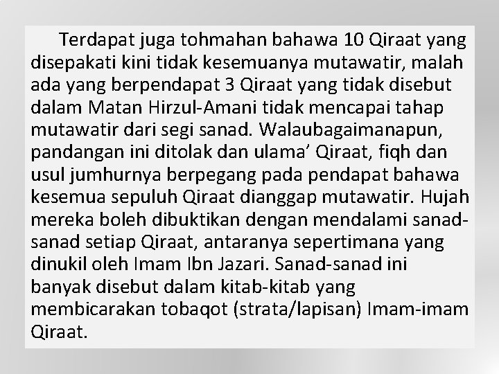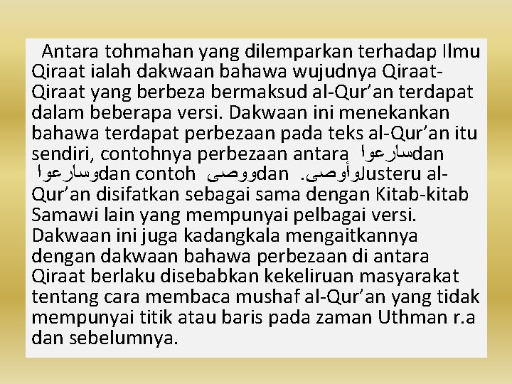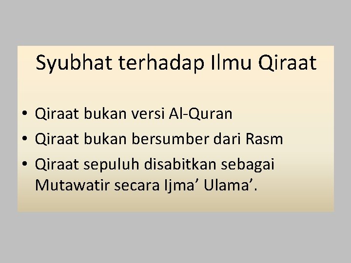 Syubhat terhadap Ilmu Qiraat • Qiraat bukan versi Al-Quran • Qiraat bukan bersumber dari Rasm • Qiraat sepuluh disabitkan sebagai Mutawatir secara Ijma’ Ulama’.