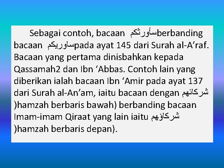 Sebagai contoh, bacaan ﺳﺄﻮﺭﺛﻜﻢ berbanding bacaan ﺳﺎﻭﺭﻳﻜﻢ pada ayat 145 dari Surah al-A’raf. Bacaan yang pertama dinisbahkan kepada Qassamah 2 dan Ibn ‘Abbas. Contoh lain yang diberikan ialah bacaan Ibn ‘Amir pada ayat 137 dari Surah al-An’am, iaitu bacaan dengan ﺷﺮﻛﺎﺋﻬﻢ )hamzah berbaris bawah) berbanding bacaan Imam-imam Qiraat yang lain iaitu ﺷﺮﻛﺎﺅﻬﻢ )hamzah berbaris depan).