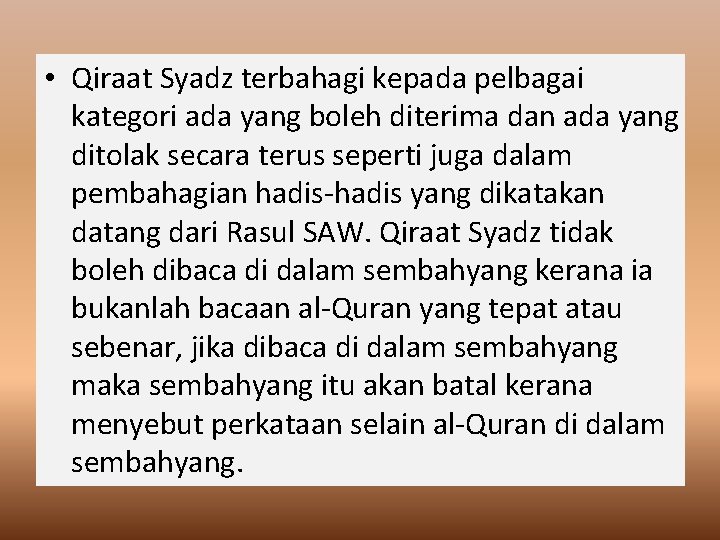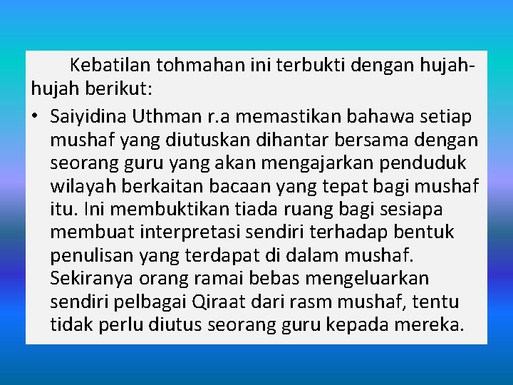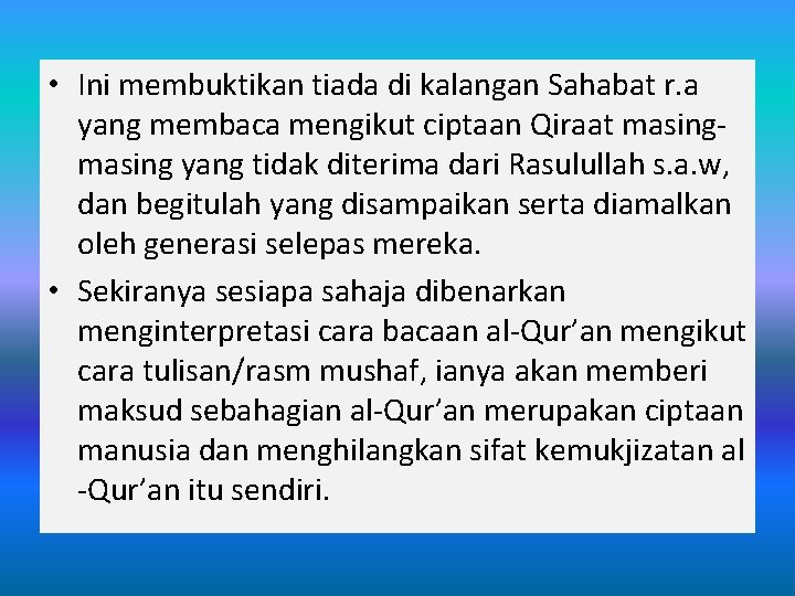• Ini membuktikan tiada di kalangan Sahabat r. a yang membaca mengikut ciptaan Qiraat masing yang tidak diterima dari Rasulullah s. a. w, dan begitulah yang disampaikan serta diamalkan oleh generasi selepas mereka. • Sekiranya sesiapa sahaja dibenarkan menginterpretasi cara bacaan al-Qur’an mengikut cara tulisan/rasm mushaf, ianya akan memberi maksud sebahagian al-Qur’an merupakan ciptaan manusia dan menghilangkan sifat kemukjizatan al -Qur’an itu sendiri.