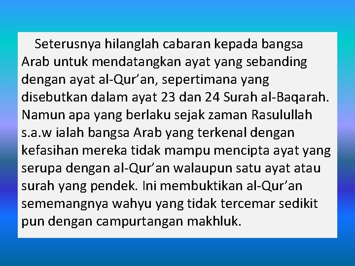Seterusnya hilanglah cabaran kepada bangsa Arab untuk mendatangkan ayat yang sebanding dengan ayat al-Qur’an, sepertimana yang disebutkan dalam ayat 23 dan 24 Surah al-Baqarah. Namun apa yang berlaku sejak zaman Rasulullah s. a. w ialah bangsa Arab yang terkenal dengan kefasihan mereka tidak mampu mencipta ayat yang serupa dengan al-Qur’an walaupun satu ayat atau surah yang pendek. Ini membuktikan al-Qur’an sememangnya wahyu yang tidak tercemar sedikit pun dengan campurtangan makhluk.
