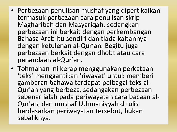 • Perbezaan penulisan mushaf yang dipertikaikan termasuk perbezaan cara penulisan skrip Magharibah dan Masyariqah, sedangkan perbezaan ini berkait dengan perkembangan Bahasa Arab itu sendiri dan tiada kaitannya dengan ketulenan al-Qur’an. Begitu juga perbezaan berkait dengan dhobt atau cara penandaan al-Qur’an. • Tohmahan ini kerap menggunakan perkataan ‘teks’ menggantikan ‘riwayat’ untuk memberi gambaran bahawa terdapat pelbagai teks al. Qur’an yang berbeza, sedangakan perbezaan sebenar ialah pada periwayatan cara bacaan al. Qur’an, dan mushaf Uthmaniyyah ditulis berdasarkan periwayatan tersebut, bukan sebaliknya.