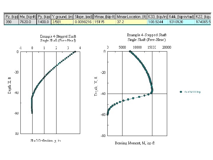 Ground Surface Pv Shaft Group (Transverse Loading) Mo Po Kgrot. Kg. Lateral Kgaxial n piles (with/without Cap Resistance) Paxial PCap Ph Kaxial KLateral Krot. (free/fixed) No Cap Paxial = Pv/ n Po = Pg = Ph * n Mshaft = Mo/n With Cap Paxial = Pv/ n + Pfrom Mo Po = Pg = PCap + Ph * n