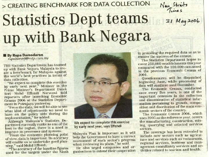 Points to be considered in planning process § DOSM – agency under the Prime Minister’s Department § Authority and alignment to regulation to undertake statistical activities – Statistics Act 1965 (Revised 1989) and Census Act 1960 § High level committee to determine guidelines, policy and priorities for statistical activities - Statistics Steering Committee (SSC) and Main User Committees § Standards for providing data to stakeholders and users – Client’s Charter (user- oriented and timely, safeguard confidentiality, courteous and professional service)