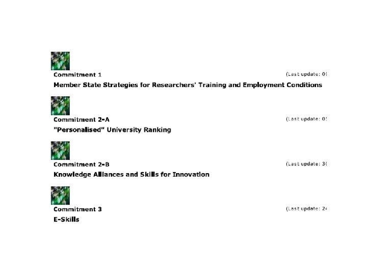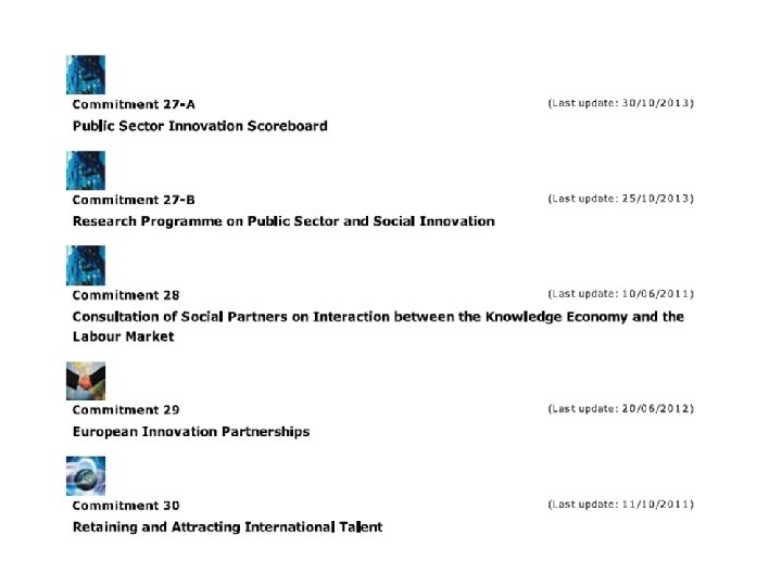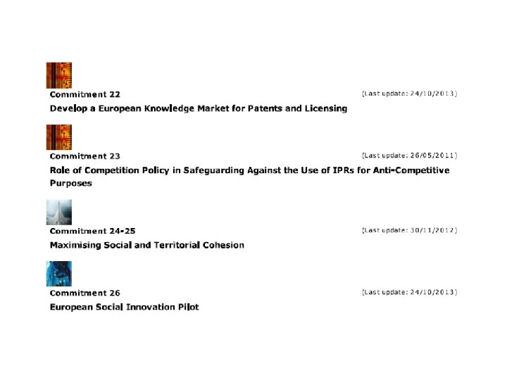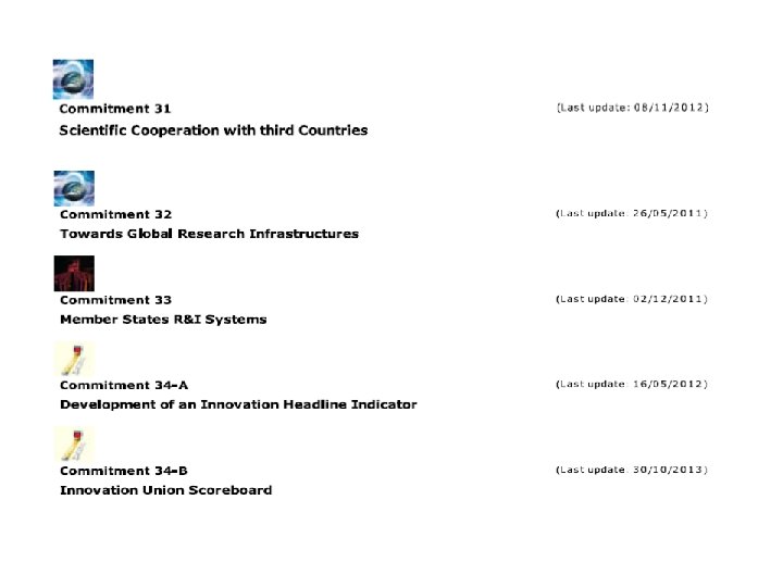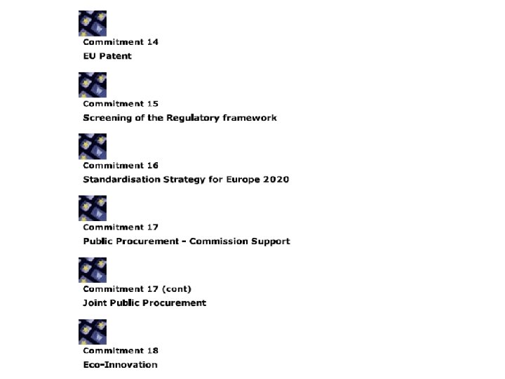 INNOVATION UNION (2010) SEC (2010) 1161 v Continue to invest in Education, R&D, Innovation and ICT v Fight EU fragmentation v Modernization and Excellence in Education Systems v Trans-EU Research and Innovation Cooperation v Simplifying access to EU programmes. Support fast-growing companies