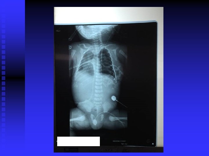 n SOG: saída de pequena quantidade de secreção sanguinolenta. n Diurese: 1, 3 ml/kg/h ( em 5 h) n Dreno de tórax: 264 ml ( em 5 h ) n Gasometria: p. H: 6, 99 Pco 2: 100, 7 Po 2: 76, 5 Bicarbonato: 24, 1 BE: - 10, 1 Sato 2: 92, 56 % n Hemograma: Ht: 49, 8% Hb: 16, 5 Lc: 8350 Plaquetas: 266 mil n Prot. Totais: 2, 7 (VR: 4, 1 -6, 3) Alb: 1, 9(VR: 2, 8 -4, 4) Glob: 0, 8 A/G: 2, 4 n Aumentado parâmetros ventilatórios: PIP: 20, PEEP: 7 FR: 50, Ti: 0, 4 Fio 2: 100% n Iniciado: Surfactante (100 mg/kg/dia) , Omeprazol, Albumina (1 g/kg em 6 h) e Furosemida (1 mg/kg)