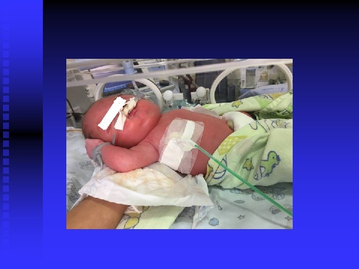 n Gasometria: p. H: 6, 90 Pa. CO 2: 91, 7 Bicarboanto: 17, 9 n Peso atual: 2134 g (perda de 566 g) n SOG (secreção acastanhada) + baixo débito urinário + bradicardia + acidose metabólica grave. n “Gaspings” + pele mosqueada + extremidades cianóticas + edema importante de estase em dorso de corpo.