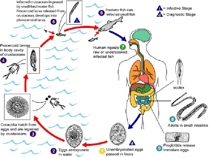 Diphyllobothrium latum n n Siklopsu yutan küçük balıklar veya bunları yutan tatlı su balıkları (II. Ara konak)’nın mezenter yağ dokusu, kaslar ve çeşitli organlarda yerleşen kurtçuk farklılaşarak pleroserkoid (sparganum) oluşur Pleroserkoidi taşıyan balıkların çiğ yada az pişmiş yenmesi sonucu, insanlara bulaşır