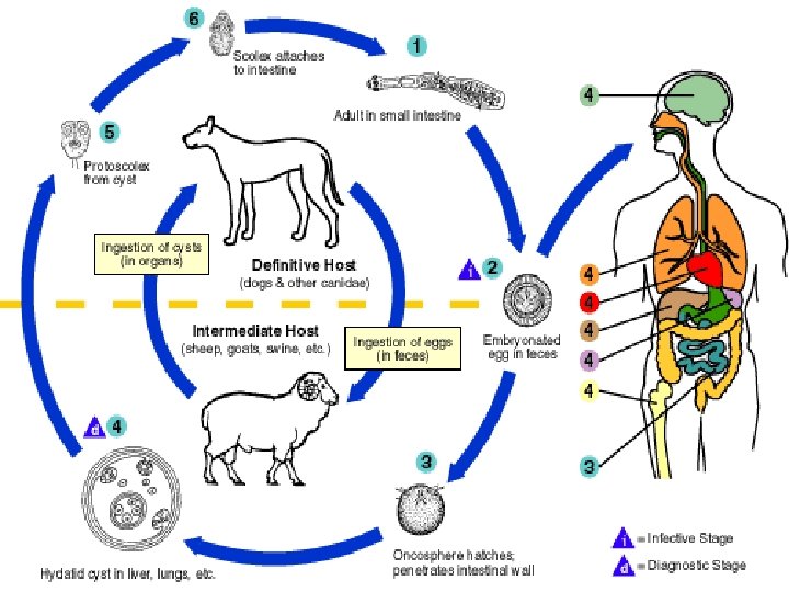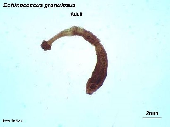 Echinococcus granulosis n n Son konağı köpek ara konağı ise hayvanlar ve insanlar olan parazitin erişkini Boyu 2 -6 mm Eni 0. 6 mm olan küçük sestodur Yumurtaları embriyonludur