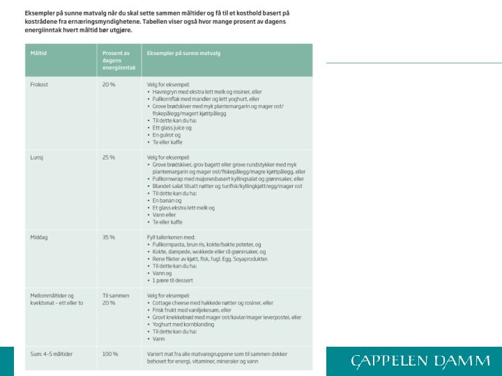 Måltidsplanlegging • Spise hver tredje til fjerde time på dagtid • Tre til fire hovedmåltider og ett til to mellommåltider • Middagen er dagens største måltid og skal gi ca. 35 % av dagens energibehov • Ikke hopp over måltider