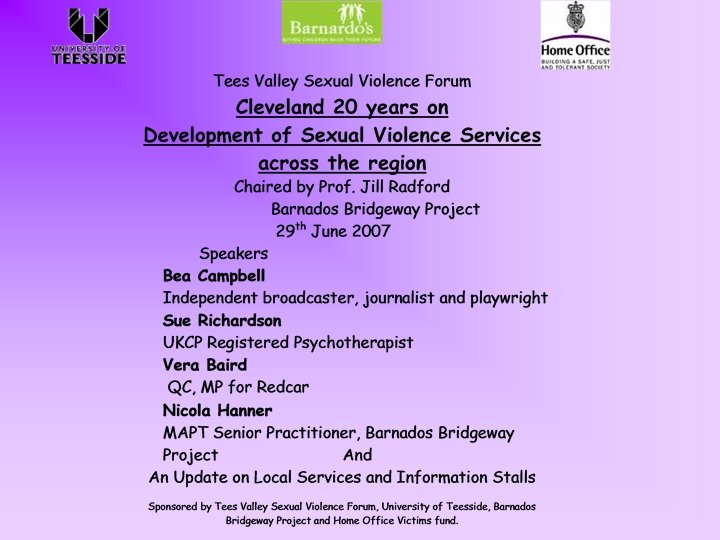 INTERNATIONAL WOMEN’S DAY EVENT BIG CONVERSATION: SEXUAL AND DOMESTIC VIOLENCE Saturday MARCH 27 th 2004, UNIVERSITY OF TEESSIDE ♀ SEXUAL OFFENCES ACT 2003 ♀ PLANNING-TEESSIDE SEXUAL ASSAULT REFERRAL CENTRE (SARC) ♀ DOMESTIC VIOLENCE, CRIME AND VICTIMS BILL 2003 Keynote Speakers: Professor Liz Kelly CBE Vera Baird Q. C. MP Dari Taylor MP Patricia Scotland, Baroness Scotland of Asthal, QC (video) Salma Castle: NISAA Professor Jill Radford: Chair