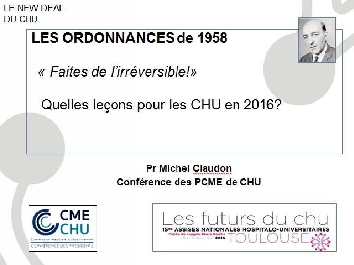 L’histoire des Ordonnances de 1958 • Jean Dausset, « jeune turc » en 1958, au 50ème anniversaire de la création des CHU: – « On peut distinguer trois étapes : • une étape d’initiation de 1955 à 1956, • une étape d’élaboration de 1956 à 1958, • et enfin une troisième étape de mise en application de 1958 à nos jours. – Cette belle réalisation, nous devons en être reconnaissants à quatre grands hommes : • le stade d’initiation, nous le devons à Pierre Mendès France ; • le stade d’élaboration et de conception, à Robert Debré ; • le stade de mise en application à Michel Debré et naturellement à Charles de Gaulle »