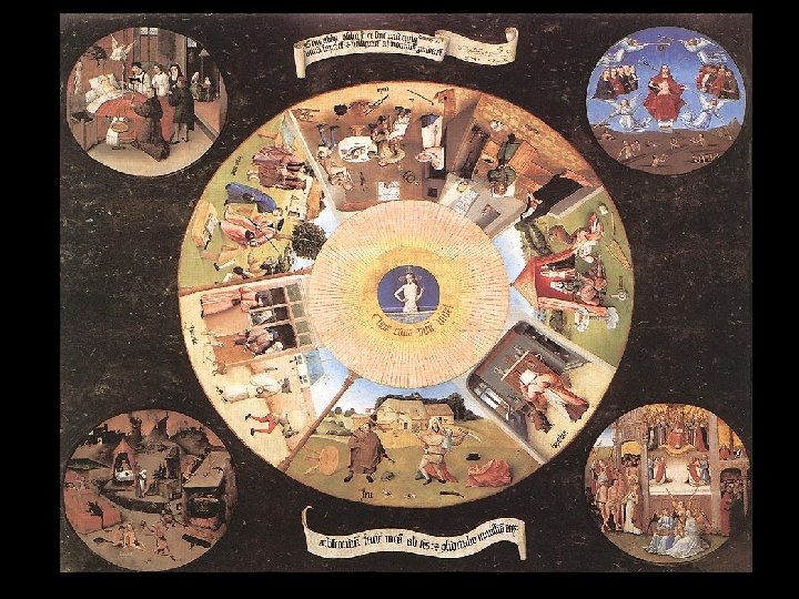The Seven Deadly Sins A painting by Hieronymus Bosch • c. 1485 (50 Kb); Prado, Madrid • depicts scenes of worldly transgressions • The circular layout with god in the center represents gods all seeing eye - No sin goes unnoticed. • In the corners of the image appear the "Four Last Things" mentioned in late medieval spiritual handbooks: Deathbed, the Last Judgment, Heaven, and Hell, all of which are favorite themes of separate Bosch panels.