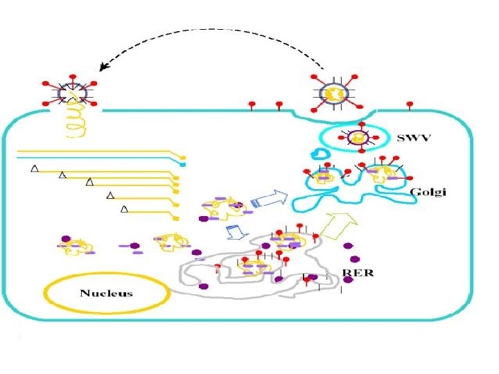 SARS-Co. V Life Cycle n n n S-protein binds to receptor initiation of induced endocytosis Translation of viral RNA polymerase Transcription of (+) RNA into genomic and subgenomic m. RNA in the cytoplasm N protein synthesized from free ribosome S and M protein synthesized in RER Budding from RER as virion, excretion from cell via Golgi