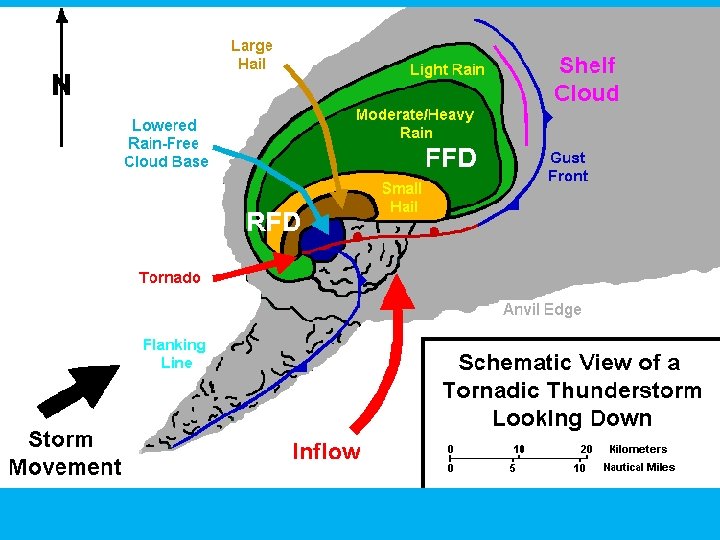 Dissipating Stage • Downdraft dominates and shuts off the updraft • Gust front moves out ahead of the storm and cuts off inflow of warm, moist air • Severe weather threat diminished • Lightning still a threat • Other storms may develop along outflow boundary