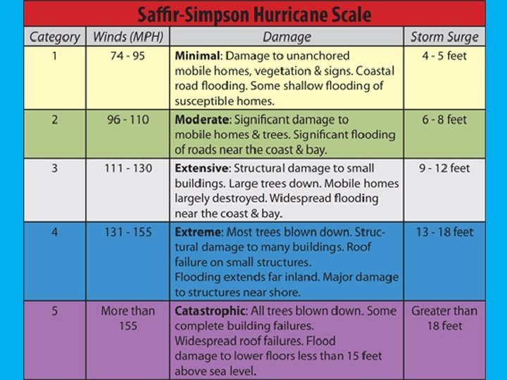 What causes the most damage? • A hurricane can cause damage by many different aspects – Very strong winds can damage structures – Heavy rainfall can cause flooding – Storm surge can inundate low-lying areas – Occasionally, lightning strikes and/or tornadoes can cause damage • Storm surge generally causes the most damage and deaths, particularly in strong hurricanes