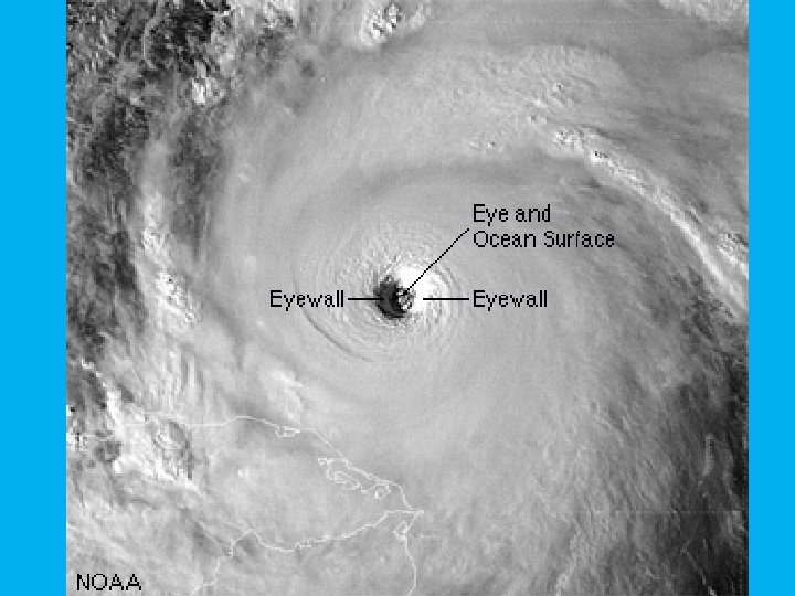 Tropical Cyclone Structure • The main parts of a tropical cyclone are the eye, the eyewall, and the rainbands • The eye – Strong rotation of the cyclone causes a vacuum of sinking air at the center which suppresses cloud formation – This creates a pocket of generally clear, calm conditions in the center – Typically 20 -40 miles across – Will usually develop when the winds exceed 74 mph but cause of eye formation still not fully understood
