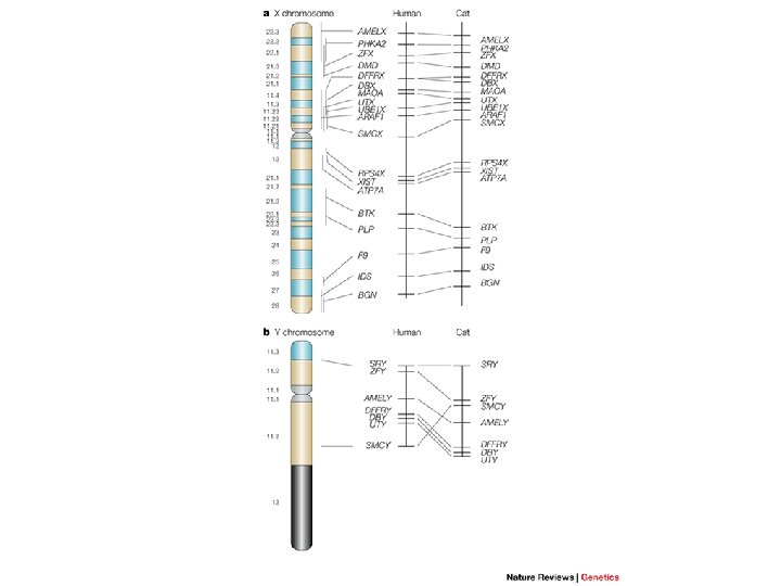 Genes on the Y Chromosome • Y chromosome has 2 pseudoautosomal regions whose genes match genes on the X chromosome • And a large central region that does not recombine with the X chromosome • This non-recombining region makes up about 95% of the chromosome