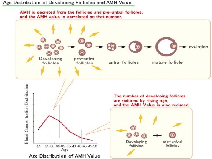 Sex Hormones Anti-Mullerian hormone “Ovarian reserve tests” q Anti-Mullerian Hormone (AMH) is a hormone produced by small follicles in the ovary which contain eggs. The amount of AMH gives an indication of the number of eggs being produced, or ovarian reserve, and can be tested at any point in a woman’s cycle q It does NOT test whether you are ovulating or not; rather it is designed to see if your ovaries are in good shape or not. q AMH is measurable from birth to near the menopause, with a peak in the mid-20 s, and from the age of 25 levels begin to decline. From the age of 35 AMH declines steadily until it reaches zero at the menopause. q AMH levels decline at predictable rates hence the AMH test is a good snapshot of current fertility.