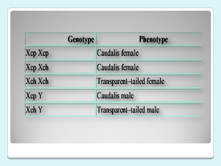 In females, most X-linked genes exhibit complete dominance. Because males have only a single X chromosome an X-linked allele is expressed in males. For example, caudalis pigmentation in guppy is due to X– linked genes. The inheritance of X-linked phenotype follows a criss-cross pattern. The father determine his daughter’s phenotype while her mother determine her sons phenotype. This phenotype is produced by the dominant Xcp allele and the recessive Xch allele. A single Xcp allele produces caudalis pigmentation in either sex. The Xch allele must be present in the homozygous state to produce the transparent phenotype in females (Xch Xch), but a single Xch allele will produce the phenotype in males (Xch Y).