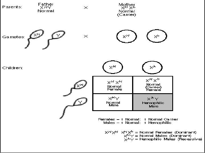 Hemophilia continued… • Hemophilia affects – males much more frequently (1 in 10, 000). – females (1 in 100, 000). • Since males only carry one X chromosome, if that is defective, hemophilia will immediately show up. • Females, carry two X chromosomes. – If only one is defective, the other normal X chromosome can compensate. The woman will have normal blood clotting; she will simply be a carrier of the recessive defective gene.