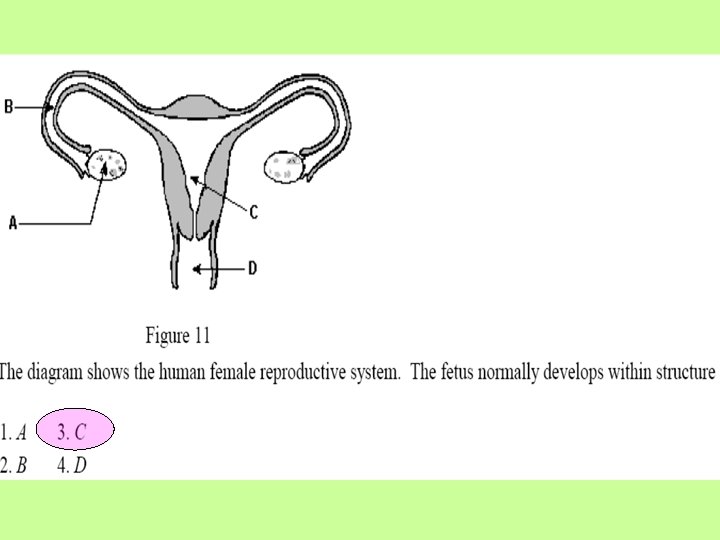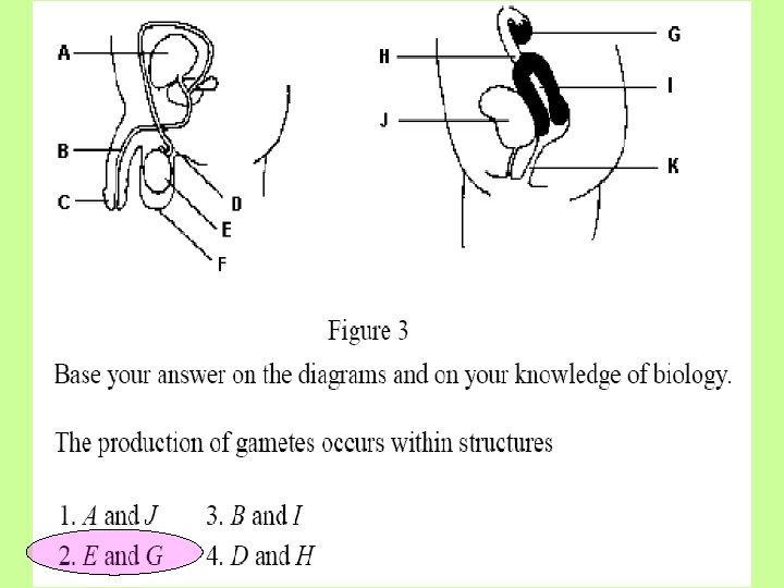 The diagram below represents the human male reproductive system. Which pair of letters indicates a structure tha produces gametes and a structure that makes possible the delivery of gametes for internal fertilization, respectively? (1) A and D (2) B and D (3) C and A (4) D and C