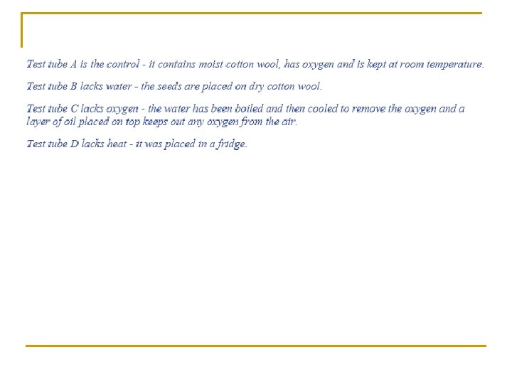 Materials and Apparatus Used: Four test tubes, cotton wool, oil, cress seeds How would you remove? n n n Water Oxygen Suitable temperature What other tube might you set up?