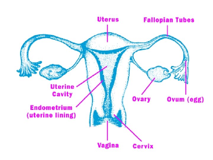 Female Reproductive system • Ovaries: Make eggs, female sex hormones: estrogen and progesterone • Oviduct/Fallopian tubes: passage for egg to the uterus • Uterus/Womb: where embryo develops • Cervix: opening of uterus into the muscular tube called vagina • Vagina: Birth canal; entry passage for the penis to deposit semen