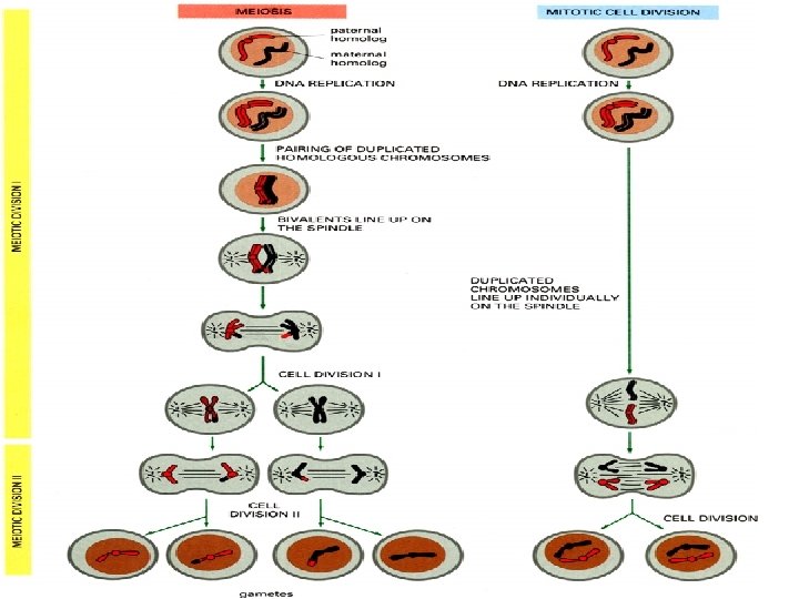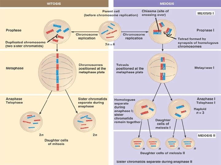 • Meiosis The process of meiosis produces gametes or sex cells. • Mitosis produces other cell types. • The process of meiosis halves the chromosome number from the original parent cell in the four cells it forms. • It does this by having two cell divisions forming four cells, where mitosis has only one cell division forming two cells. • Both processes start out with one doubling or replication of the chromosome material.
