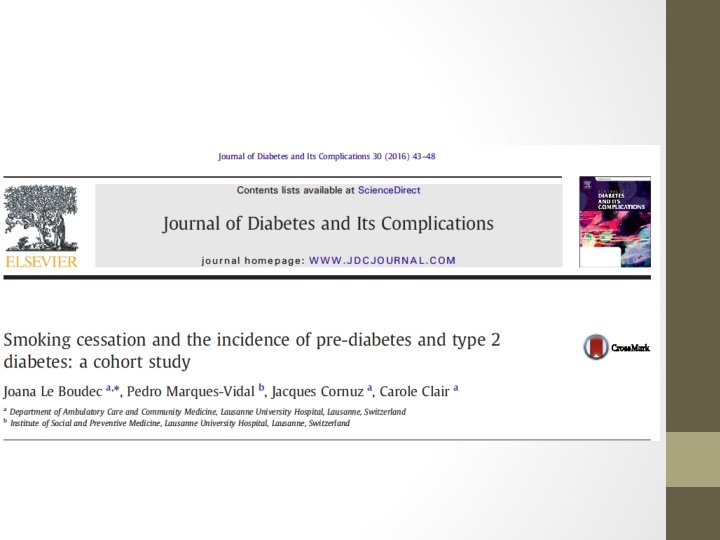 • Kore’de yapılan bir çalışmada 2 -4 yıldır sigarayı bırakmış olan erkeklerde hiç sigara içmeyenlere göre Tip 2 DM riskinde önemli derecede artış vardır. • 2010 yılında Amerika’da yapılan çalışmada erkek ve kadınlarda sigara içicilere göre sigarayı bıraktıktan sonraki 6 yıl içinde Tip 2 DM gelişimi için artmış risk gösterilmiştiir. Sigarayı yeni bırakanlar (3. 8 kg) sigara içenlere(0. 6 kg) göre daha fazla kilo almışlardır. • Tüm bu çalışmalarda sigara içmeyenler referans olarak alınmıştır. Sigarayı bırakanlar ve sigara içmeye hala devam edenler direkt olarak karşılaştırılmamış ve BAG gelişme riski değerlendirilmemiştir.