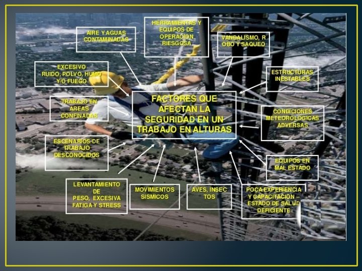 CONDICIONES DE SEGURIDAD Trabajo en alturas Cualquier actividad o desplazamiento que realice un trabajador mientras este expuesto a un riesgo de caída de distinto nivel, Se considerará también trabajo en altura cualquier tipo de trabajo que se desarrolle bajo nivel cero, como son: pozos, ingreso a tanques enterrados, excavaciones de profundidad mayor a 1. 5 metros y situaciones similares; en estos casos se comienzan a compartir conceptos de trabajo en espacios confinados. • Según Marco Legal del Trabajo en Altura Ley Orgánica de Prevención, Condiciones y Medio Ambiente de Trabajo. Artículo 56 : Son Deberes de los empleadores, adoptar las medidas necesarias para garantizar a los trabajadores y trabajadoras condiciones de salud, higiene, seguridad y bienestar en el trabajo • Artículo 59 : el trabajo deberá desarrollarse en un ambiente y condiciones adecuadas de manera que: 1. - Asegure a los trabajadores el más alto grado posible de salud física y mental…. 3. - Preste protección a la salud y la vida de los trabajadores contra todas las condiciones peligrosas en el trabajo… 6. - garantice el auxilio médico inmediato al trabajador lesionado o enfermo