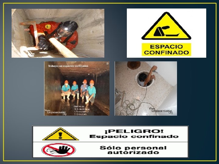 ESPACIOS CONFINADOS Un "espacio confinado" hace referencia a un espacio que por su diseño tiene un número limitado de aberturas de entrada y salida, cuenta con una ventilación natural desfavorable que podría contener o generar peligrosos contaminantes del aire, y no está destinado para una presencia continua de empleados. Los espacios confinados incluyen, entre otros, tanques des engrasadores, tanques de reacción, calentadores o calderas, ductos de ventilación y escape, alcantarillas, túneles, instalaciones subterráneas de servicios y tuberías. EFECTOS POSIBLES QUE LE CAUSAN AL TRABAJADOR: En los espacios confinados restringidos pueden presentar los siguientes riesgos: - Si la atmósfera contiene menos del 19, 5% de oxígeno por volumen, debe ventilarse el área para aumentar la concentración o entrar al espacio restringido con Protección respiratoria y línea salva vidas. - Si la atmósfera contiene más del 22% de oxígeno por volumen, la fuente generadora del exceso de oxígeno debe ser localizada y reparada antes de comenzar los trabajos en el espacio restringido. El monitoreo de oxígeno se debe realizar en forma permanente con un indicador de lectura directa. Condiciones ambientales para autorizar el ingreso: - Nivel de oxigeno: Los niveles de oxígeno deben estar entre 19. 5% y 23. 5% mientras que cualquier persona esté en el interior del espacio. Los niveles inferiores crean un riesgo para afectar la respiración y causar enfermedad o muerte; y los niveles por encima del máximo aumentan la inflamabilidad de los materiales combustibles.