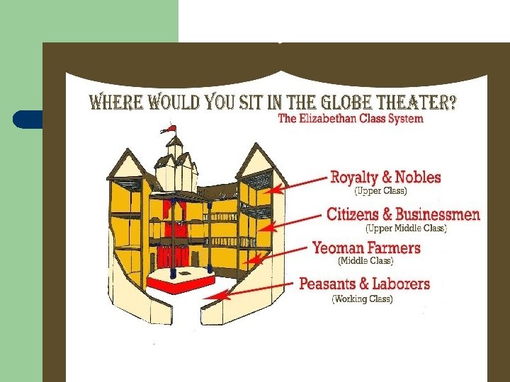 The Globe Theatre l l Opened in 1599; church protested Located outside of London Structure: See handout People who attended l 1. women l 2. Queen Elizabeth I (often) l 3. Groundlings- poor, uncultured people who sat on the ground; brought own food, threw at actors for a bad performance (cost: 1 penny to attend)