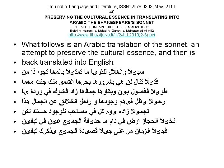 Then is back translated into English. • • • • Who can dare compare you to a gazelle? Pleiades and moon haven’t any way However much the hot sun from you does gain Would have but a stone thread of dates A rose whose beauty is enhanced by thorns All the seasons you’ll stay alive From all creatures beauty must depart So long you betwixt them remain But your beauty shall this life share And increase at every dawn of day All but a garden you shall see So long as in H ijāz palm trees grow A poem sung by all you shall be Throughout the ages year by year