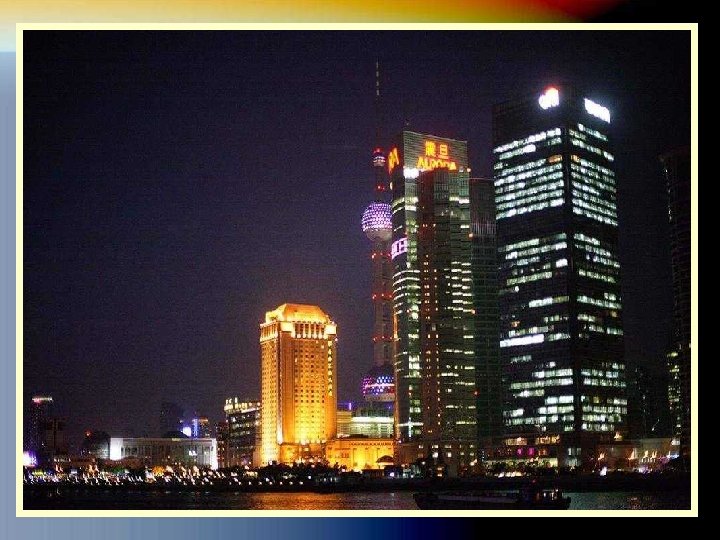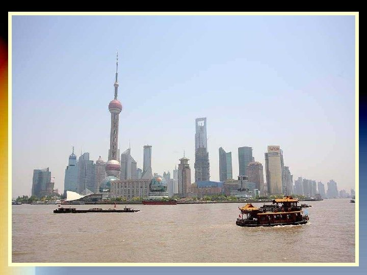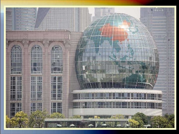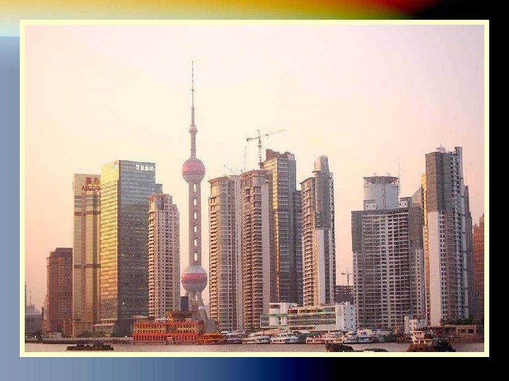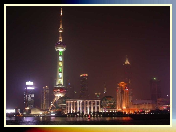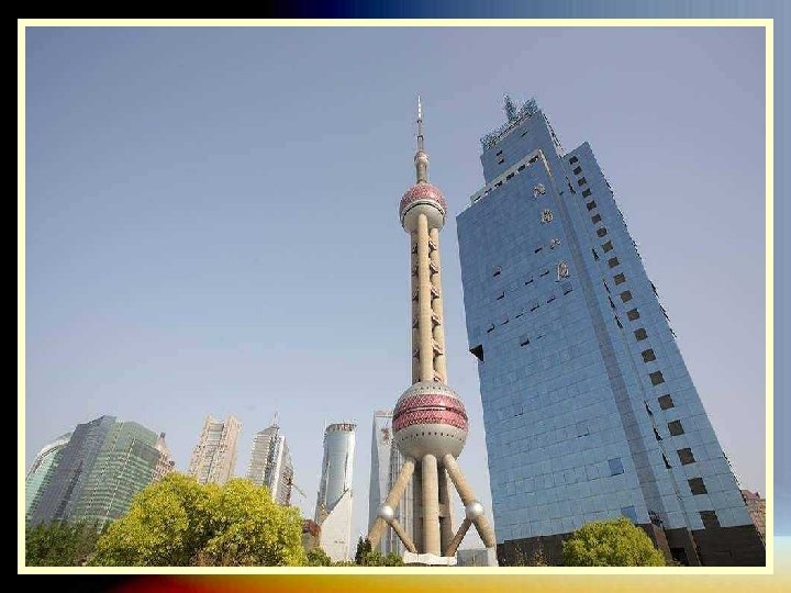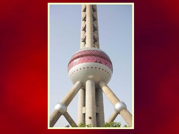 LA TORRE PERLA DE ORIENTE La Perla de Oriente es una de las torres más altas de Shanghai. Se trata de la torre de la televisión. Tiene forma de trípode y su diseño es bastante futurista, con dos esferas grandes de color rojo y la enorme antena en lo alto