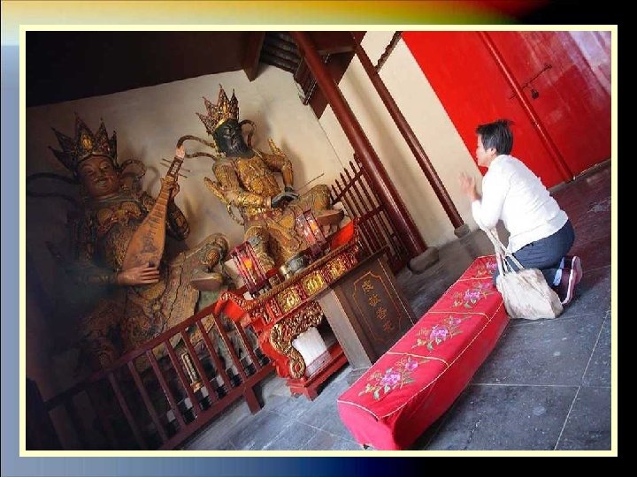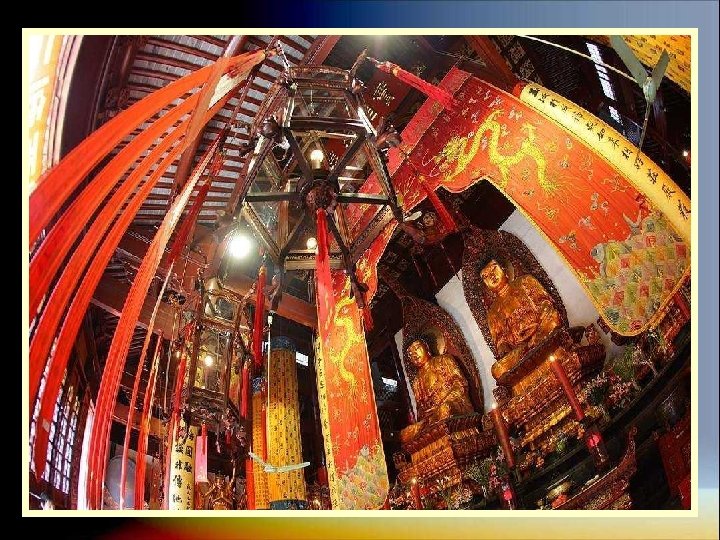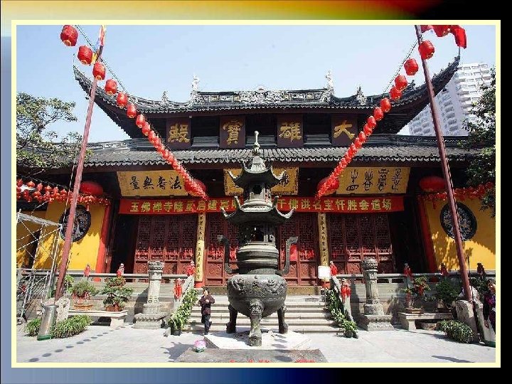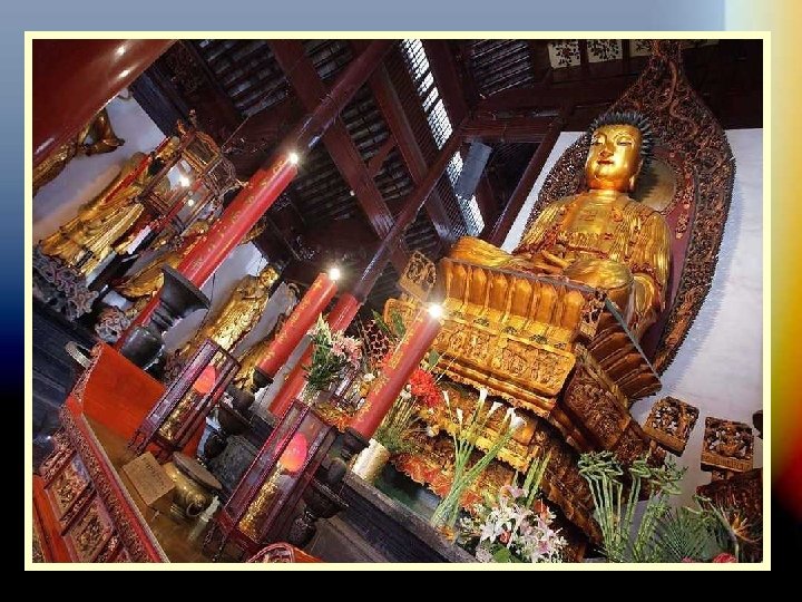 EL TEMPLO DE BUDA DE JADE Es un templo budista que fue construido en el año 1889 y tiene dos estatuas de buda en jade. Construido a finales de la época Qing, esta protegido por un muro de color amarillo y fue levantada para albergar dos estatuas de Buda realizadas en jade, traídas en 1882 de Birmania por el monje Huigen. Sufrió restauraciones en 1912, 1952 y 1993. Resultó intacta tras los ataques de los Guardias Rojos durante la Revolución Cultural gracias a que los monjes colocaron una imagen de Mao en las puertas del templo. Las cubiertas de los edificios estan decoradas con esculturas y campanillas que ahuyentan los malos espíritus del templo.