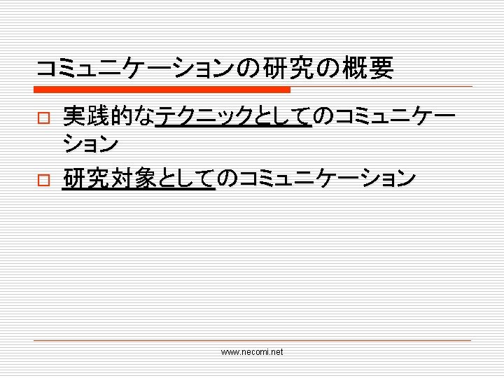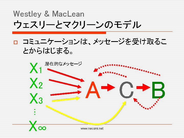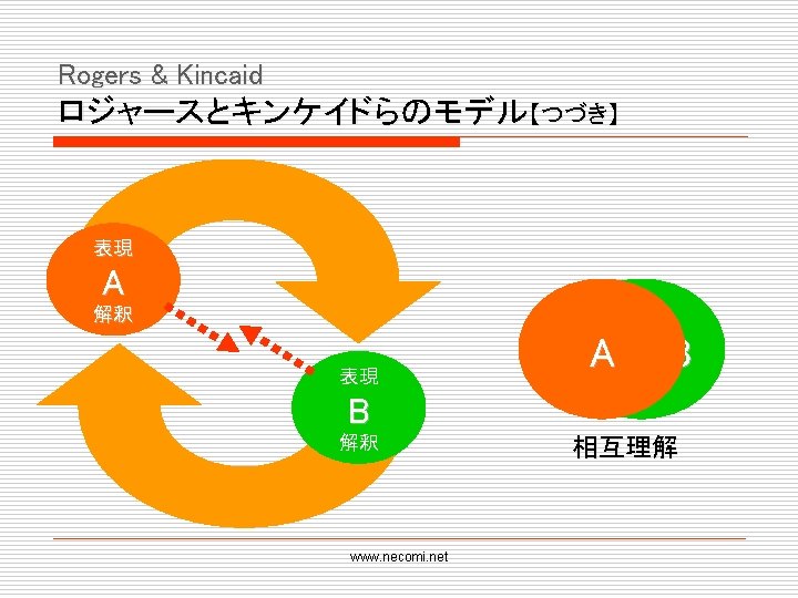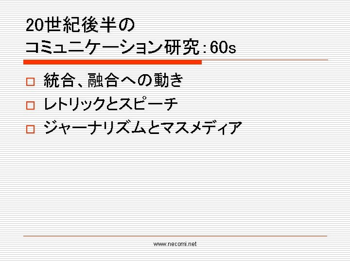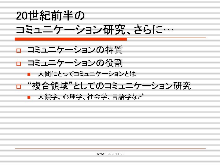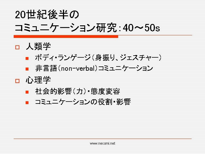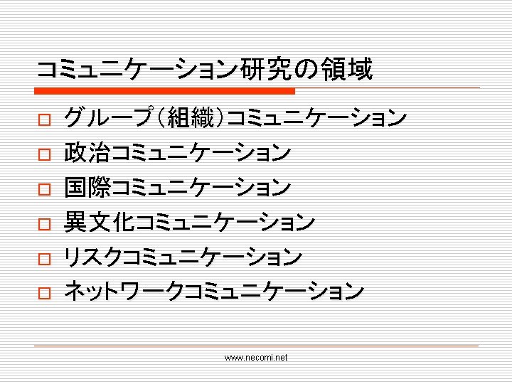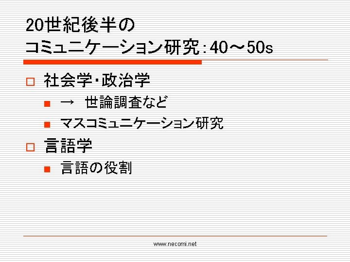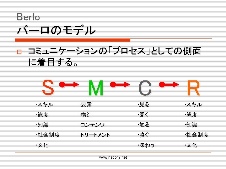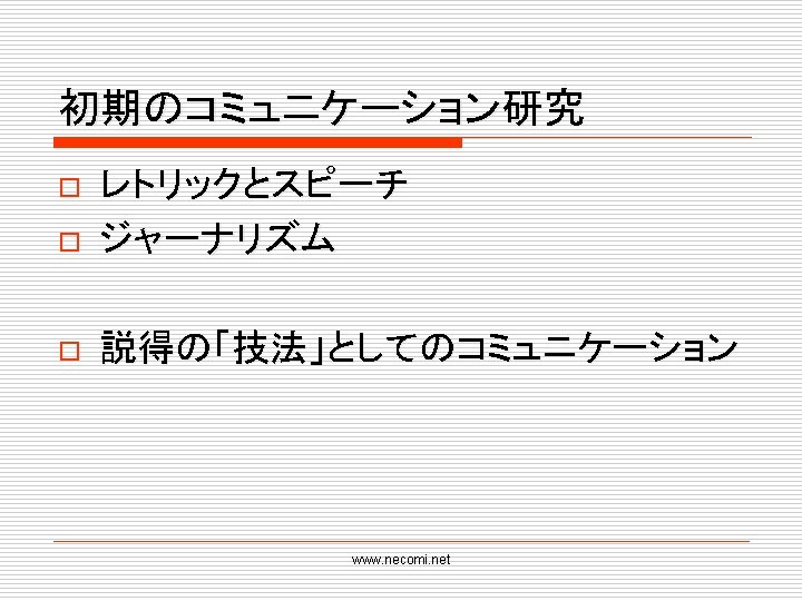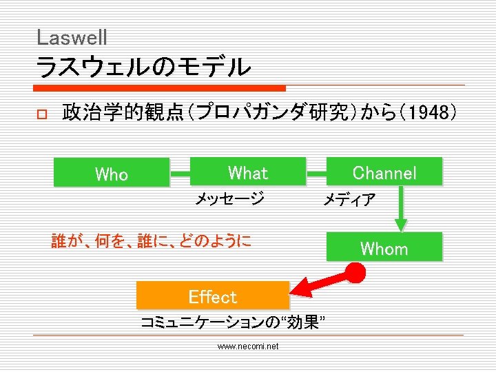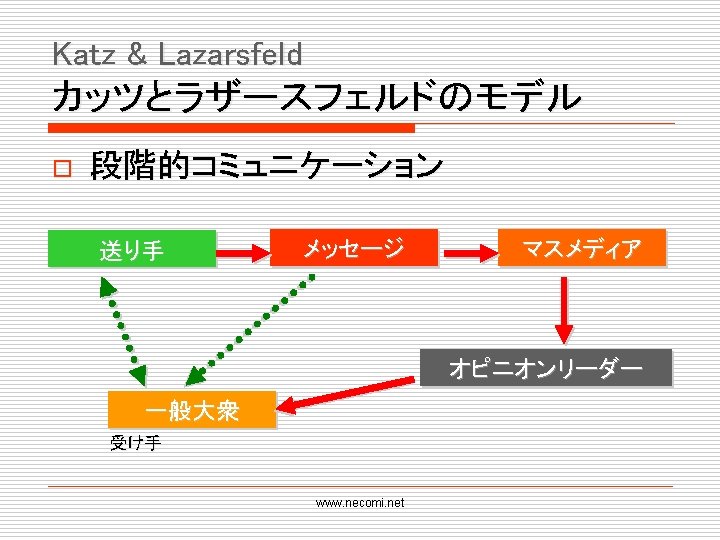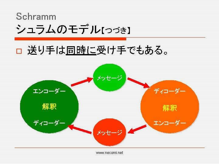 Schramm シュラムのモデル【つづき】 o 言語、文化、などを共有しているかどうか Field of Experience Source Encoder Signal Decoder Destination 受け手 送り手 The Process and Effects of Mass Communication (1965) www. necomi. net
