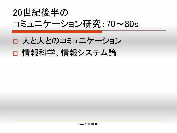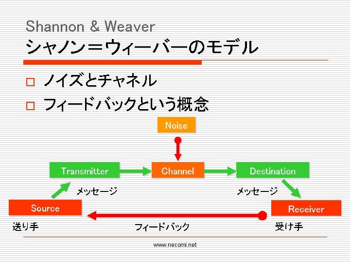 Shannon & Weaver シャノン=ウィーバーのモデル o o 情報理論(1949) 送り手から受け手への、メッセージの「伝 達」 Transmitter Channel メッセージ Source 送り手 Destination Receiver Noise The Mathematical Theory of Communication (1949) www. necomi. net 受け手
