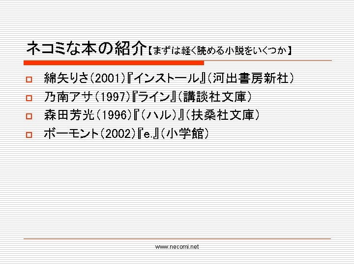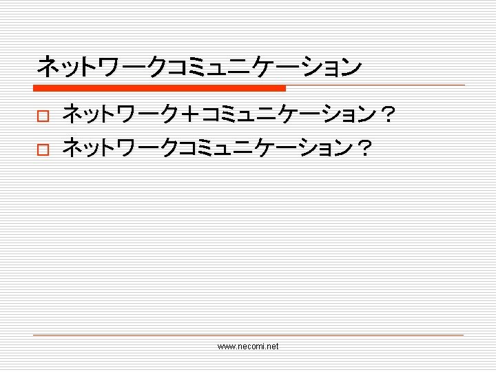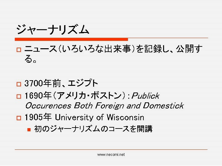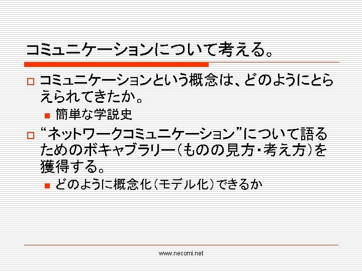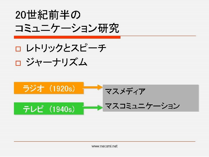 【おまけ】あたらしいマスコミ研究の流れ o o デジタル化 ビデオクリップの流通 n http: //www. moderntv. com/ o o http: //www. moderntv. com/modtvweb/qtclips/iraqclip 1. htm http: //www. moderntv. com/modtvweb/qtclips/iraqclip 2. htm www. necomi. net
