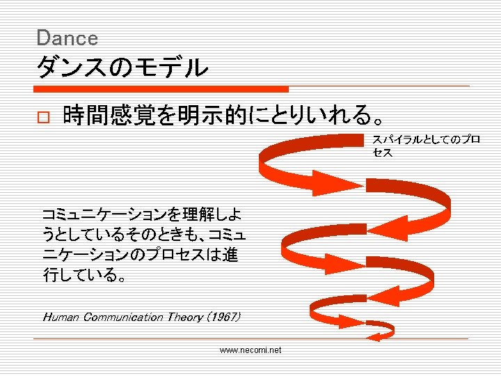 Watzlawick, Bervin & Jackson ワツラウィックらのモデル o コミュニケーションをプロセスとしてとらえる。 1 3 5 7 9 11 A メッセージ B 2 4 6 Pragmatics of Human Communication (1967) www. necomi. net 8 10
