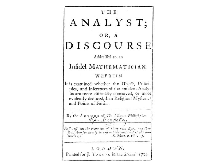 Bishop Berkeley’s Queries • Query 64 Whether mathematicians, who are so delicate in religious points, are strictly scrupulous in their own science? Whether they do not submit to authority, take things upon trust, and believe points inconceivable’? Whether they have not their mysteries, and what is more, their repugnancies and contradictions?