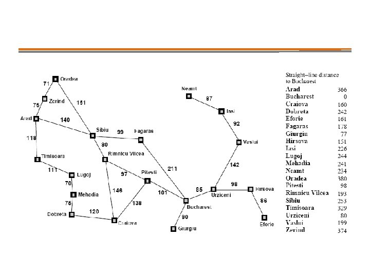 Greedy search • • – – • • • Let evaluation function f(n) be an estimate of cost from node n to goal This function is often called a heuristic and is denoted by h(n). f(n) = h(n) e. g. h. SLD(n) = straight-line distance from n to Bucharest Greedy search expands the node that appears to be closest to goal. Contrast with uniform-cost search in which lowest cost path from start is expanded. Heuristic function is the way knowledge about the problem is used to guide the search process.