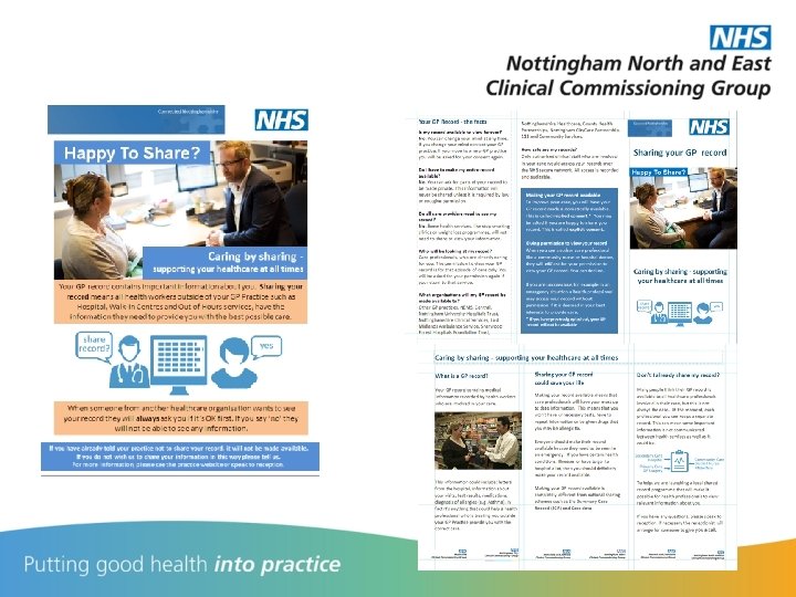 • Legal duty to make records available to share • Must adhere to Data Protection Act • Must adhere to all 7 Caldicott principles • 1 -6 keeping information safe • 7 duty to share information • RIG Guidance Notice to all healthcare organisations for records to be made available to share • Agreed to set implied consent to all records • Does not over-ride any dissents already set