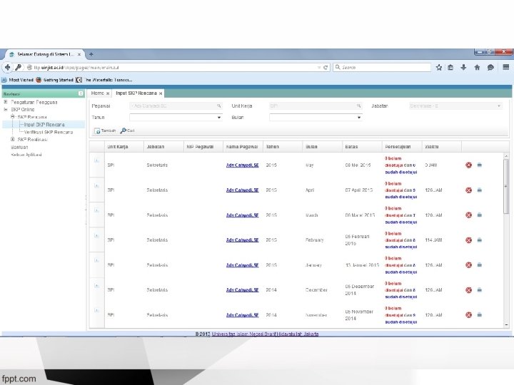 Ketentuan dalam Pengisian SKP Rencana 1. • Jobdesc yang diisi pada SKP rencana adalah jobdesc yang telah disesuaikan dengan jabatan dan unit kerja. 2. • Jam Kerja Pada SKP Rencana tidak boleh melebihi jam kerja yang ditentukan (6 jam x Jumlah hari efektif kerja). 3. • Atasan Langsung harus memvalidasi SKP rencana pegawai bawahannya sesuai batas waktu yang telah ditentukan