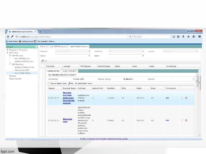 Ketentuan dalam Pengisian Catatan Harian 1. • Pegawai harus mengisi Catatan Harian setiap hari atau paling lambat akhir pekan sesuai dengan realisasi. 2. • Atasan Langsung memvalidasi setiap Uraian Tugas Jabatan pada Catatan Harian pegawai di bawahnya paling lambat akhir bulan SKP 3. • Tugas yang tidak terdapat dalam Uraian Tugas Jabatan, diinput sebagai Tugas Tambahan